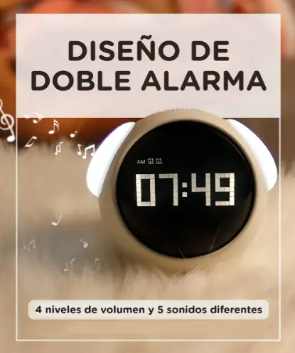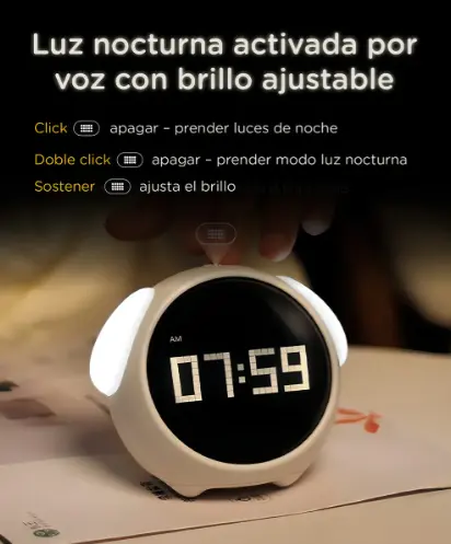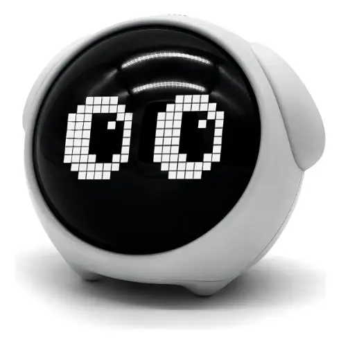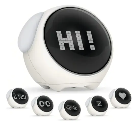Este despertador destaca por su pantalla digital dinámica que muestra emotivos emojis, transformando un objeto cotidiano en un compañero de habitación. Su diseño redondeado y suave lo hace seguro y atractivo para todas las edades, siendo una excelente opción de regalo para quienes buscan algo original y funcional.